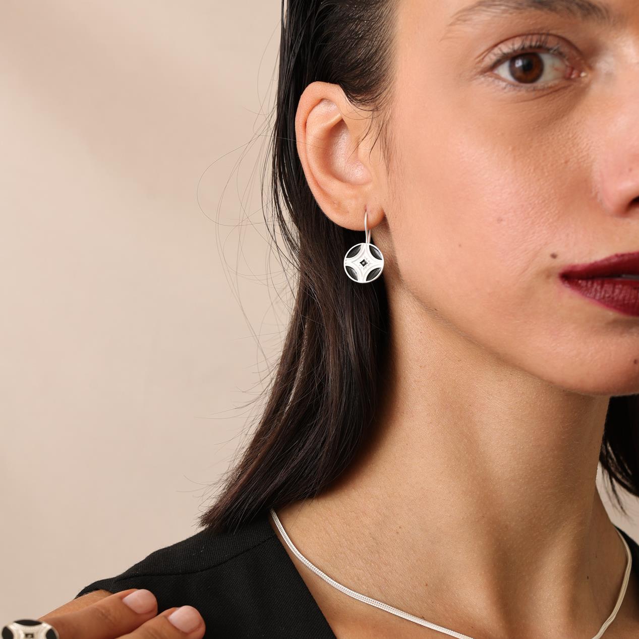 80.00 € inkl. Mwst.Diese eleganten handgefertigten runden Ohrringe für Damen verbinden modernes Design mit hochwertigen Materialien. Gefertigt aus 925er Sterling Silber, werden die Ohrringe durch schwarze Emaille akzentuiert, die ihnen eine stilvolle und ausdrucksstarke Optik verleiht.