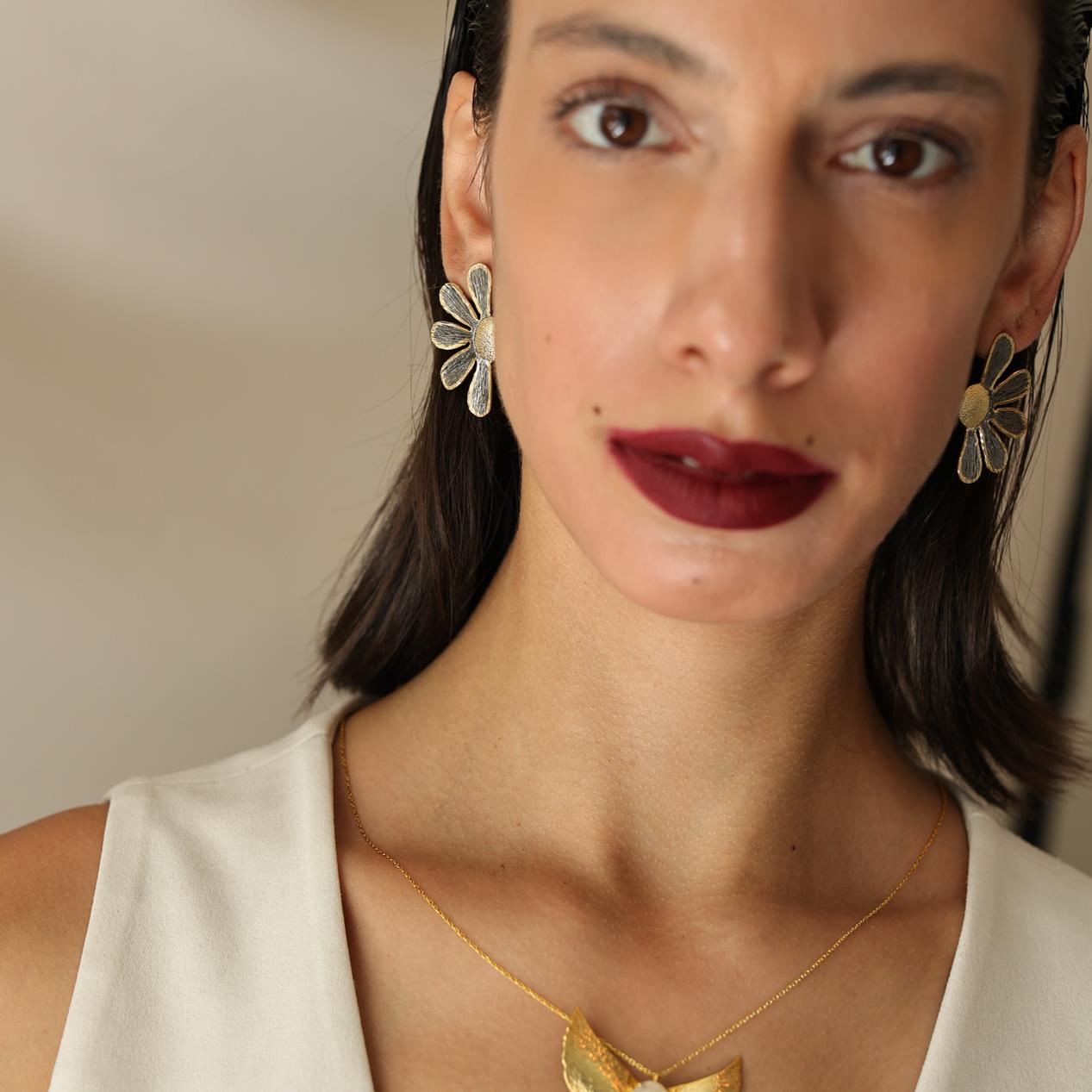 123.00 € inkl. Mwst.Diese eleganten handgefertigten Blumen-Ohrringe für Damen vereinen verspieltes Design mit hochwertigen Materialien. Gefertigt aus 925er Sterling Silber und 14 Karat vergoldet, überzeugen die Ohrringe durch ihre filigrane Blumenform, die einen femininen und stilvollen Akzent setzt.