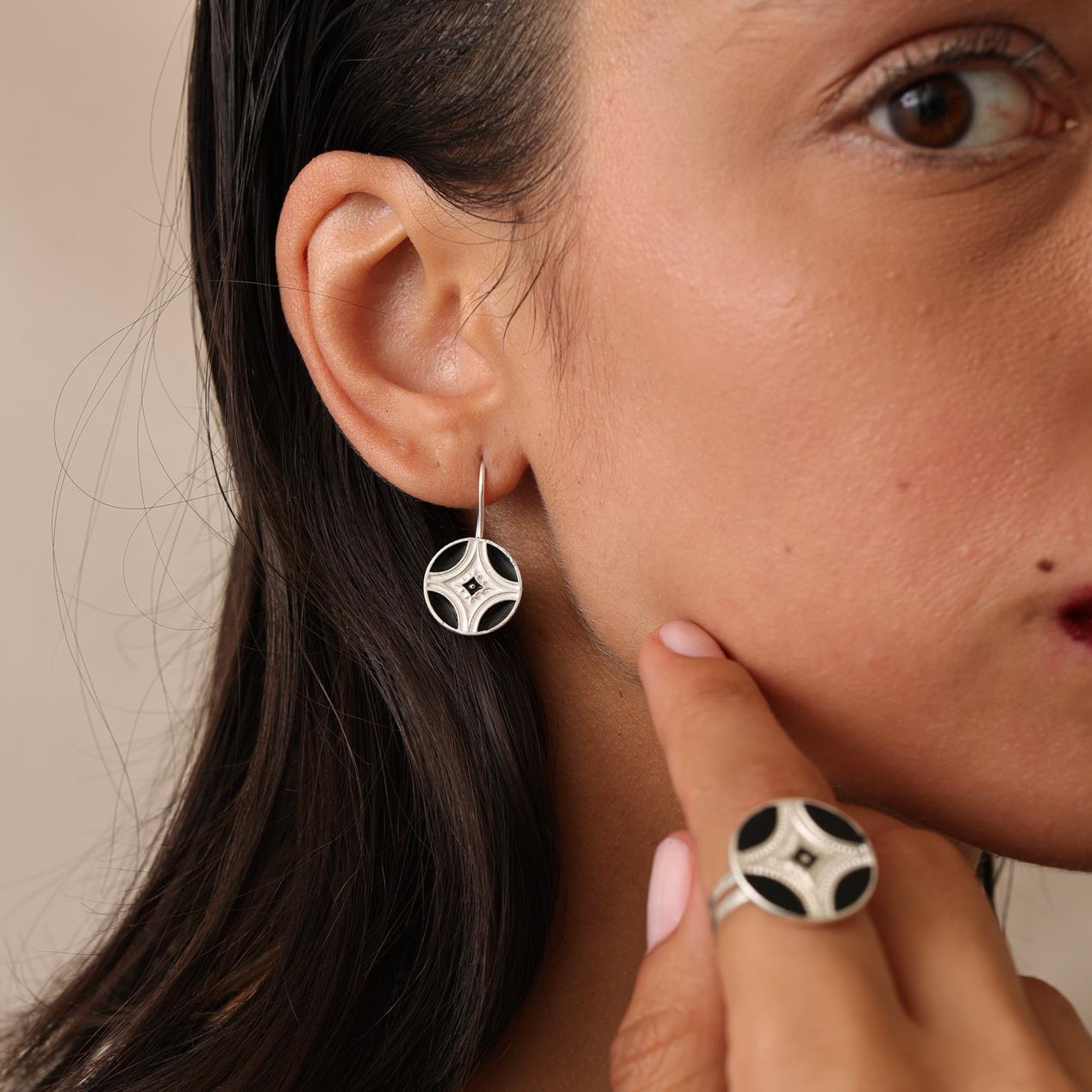 80.00 € inkl. Mwst.Diese eleganten handgefertigten runden Ohrringe für Damen verbinden modernes Design mit hochwertigen Materialien. Gefertigt aus 925er Sterling Silber, werden die Ohrringe durch schwarze Emaille akzentuiert, die ihnen eine stilvolle und ausdrucksstarke Optik verleiht.